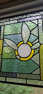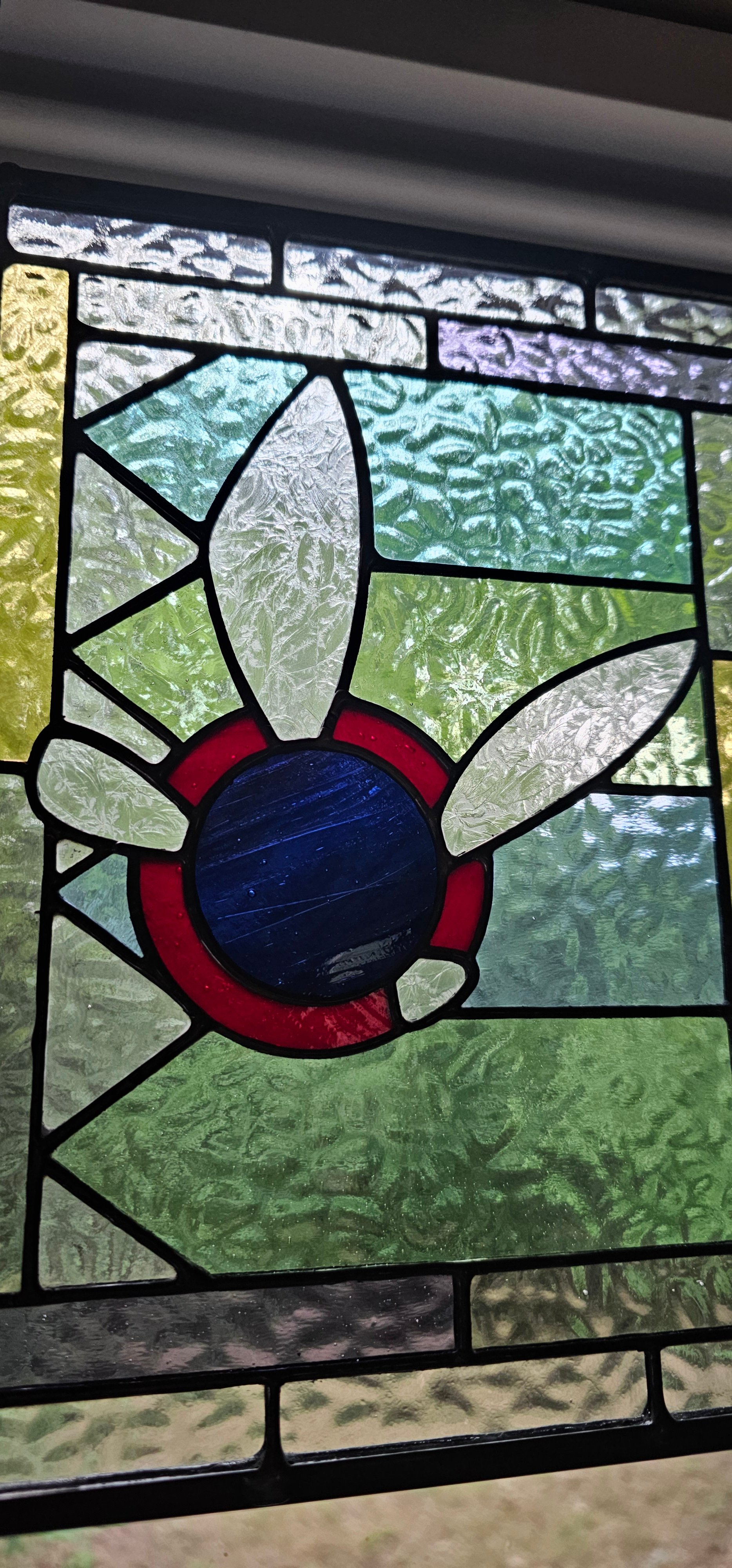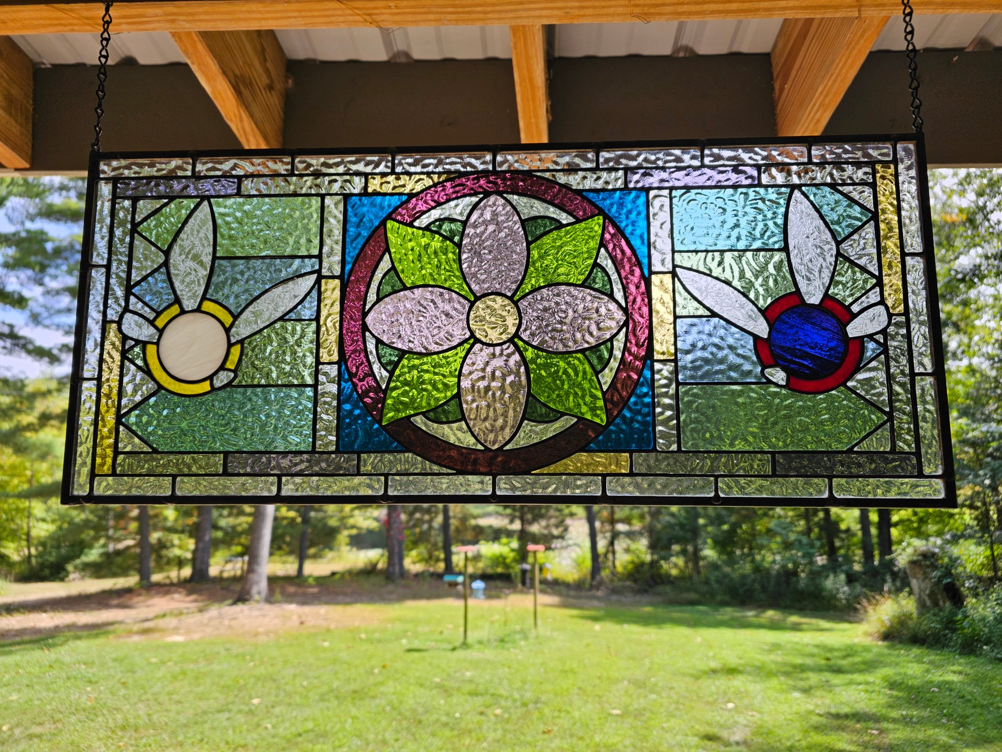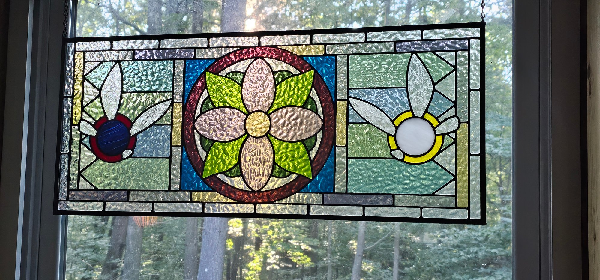 Majora's Mask panel designed in the style of a Victorian stained glass transom. Features Tatl and Tael, the Majora's Mask fairies, with a Deku flower in the center.